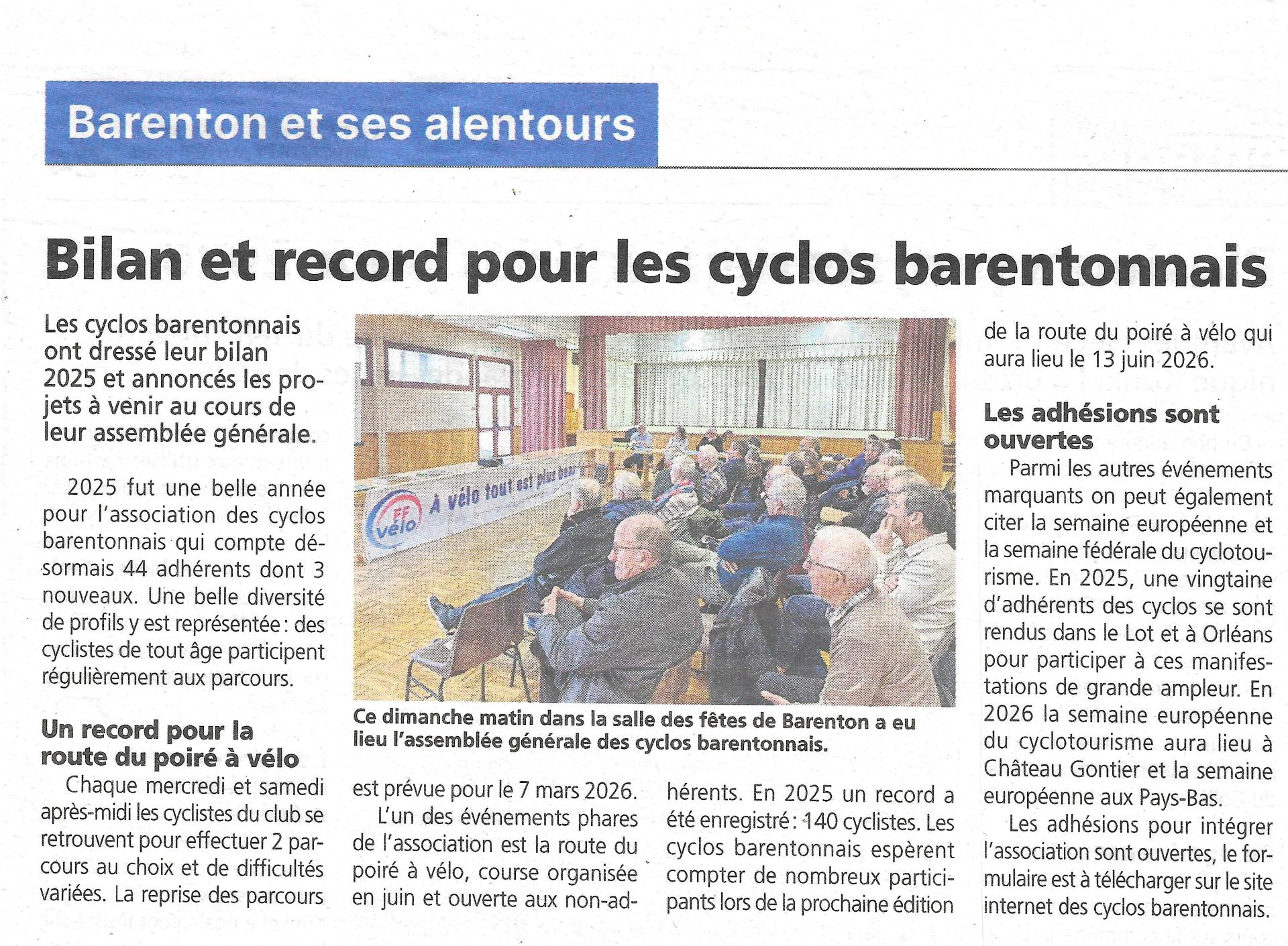 L'assemblée générale des cyclos Barentonnais s'est déroulée le dimanche 18 janvier 2026 à la salle des fêtes de Barenton.Une trentaine d'adhérents étaient présents pour ce premier rendez-vous de l'année. Les cyclos ont écouté avec attention et approuvé tous les rapports de l'association .Lire la suite.....